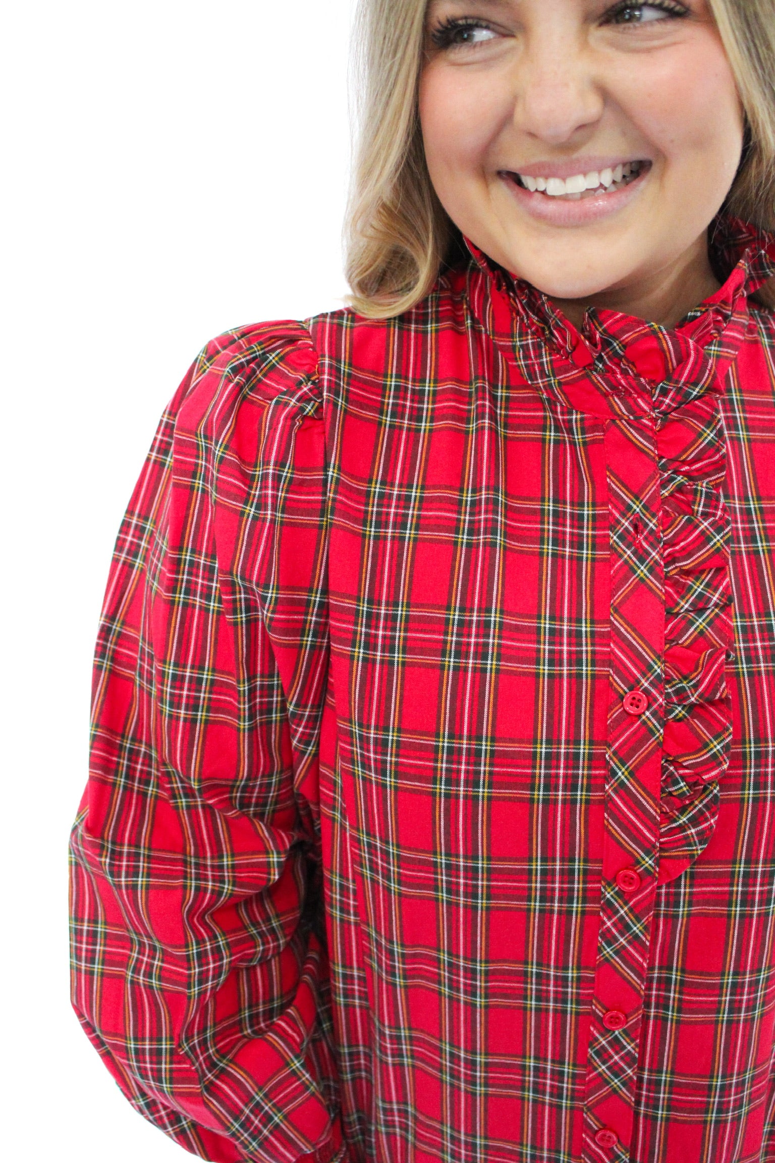 - Long sleeve red plaid top with ruffle details on hemlines