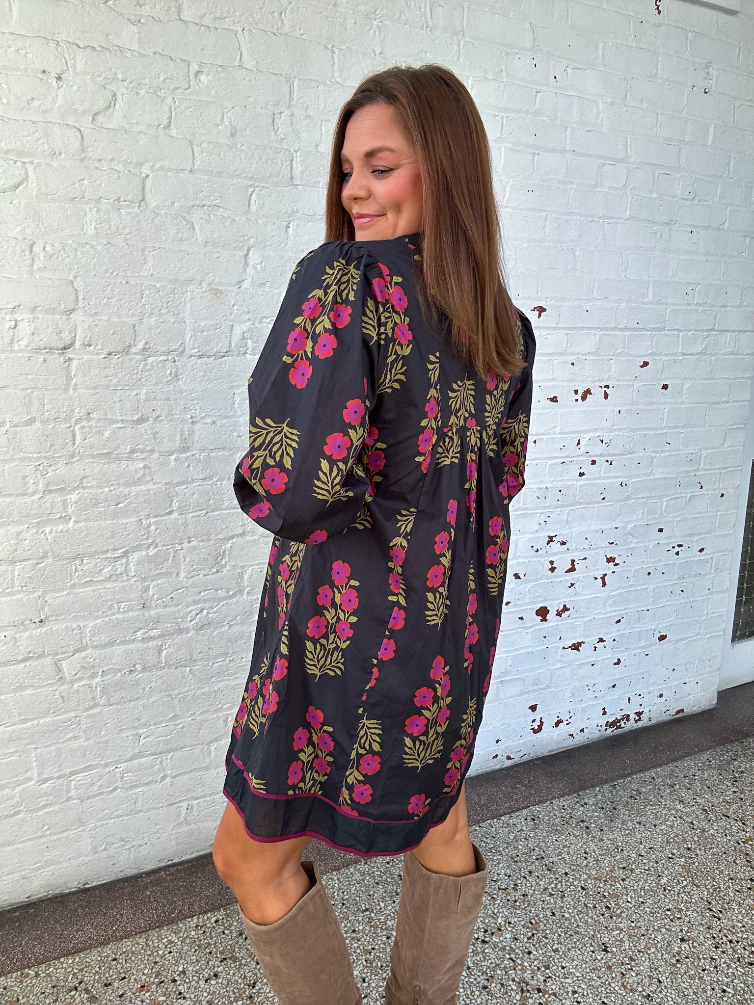 - Black mini dress with vibrant floral detailing all over