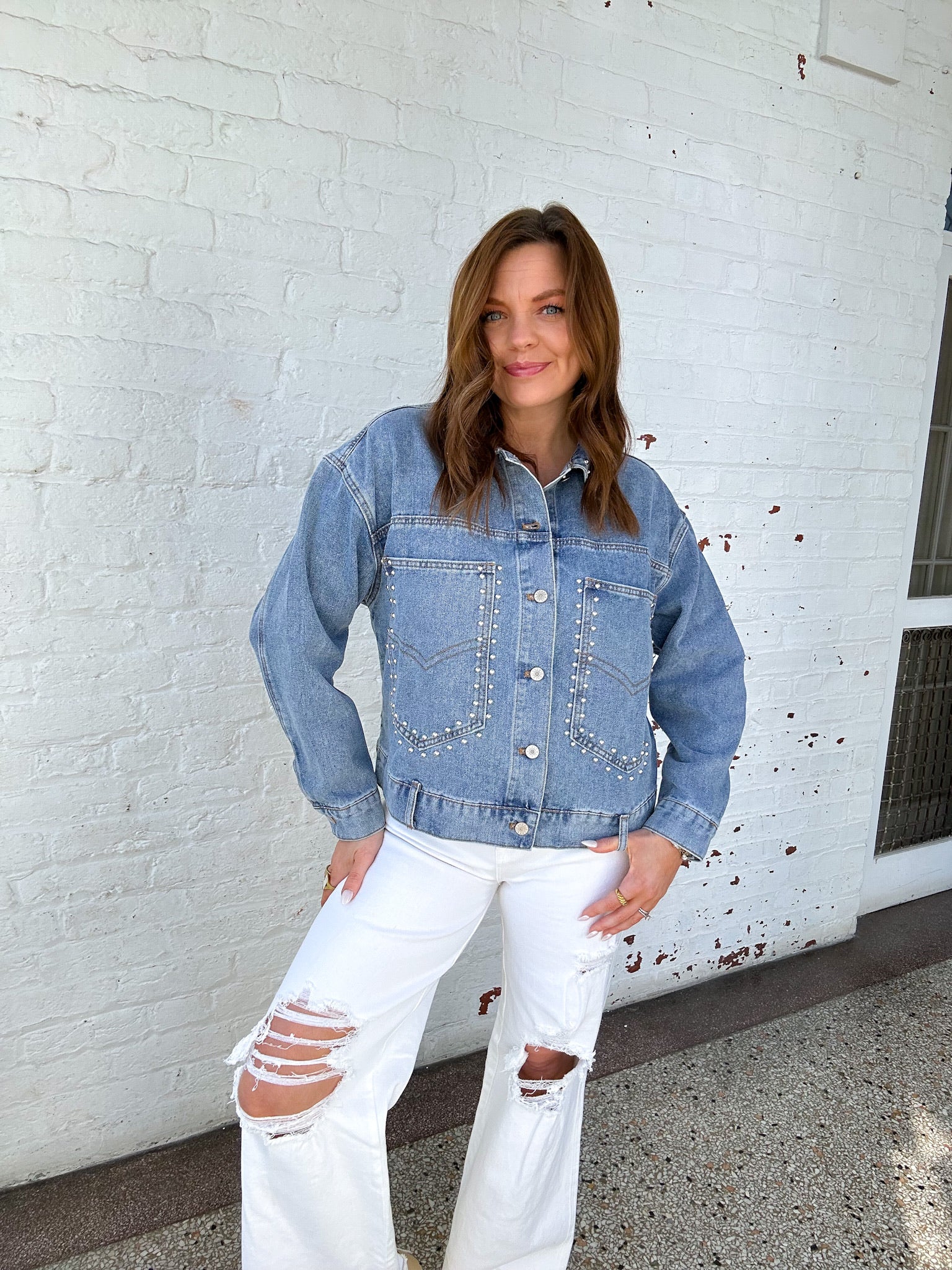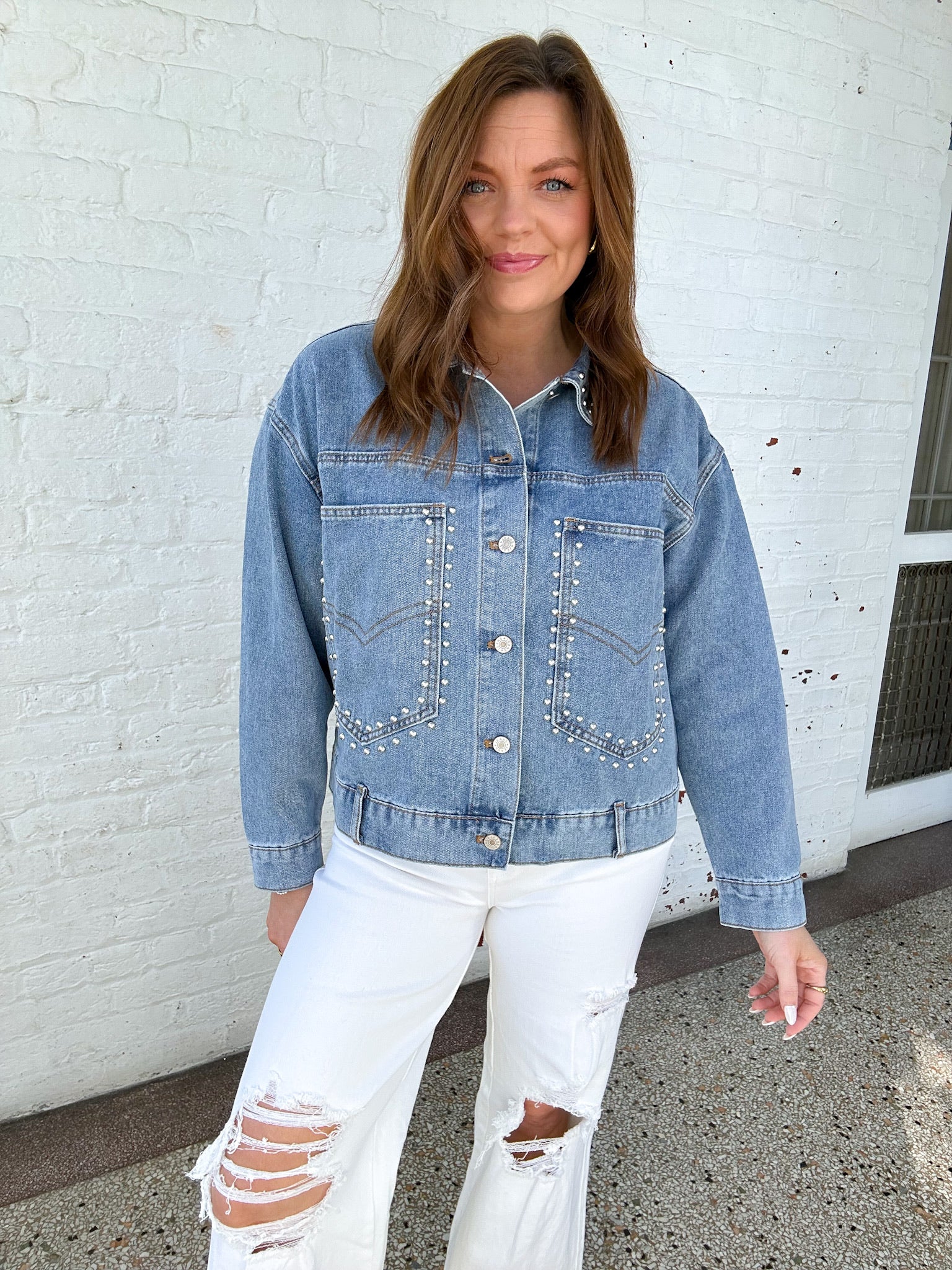 - medium wash denim jacket with silver stud details